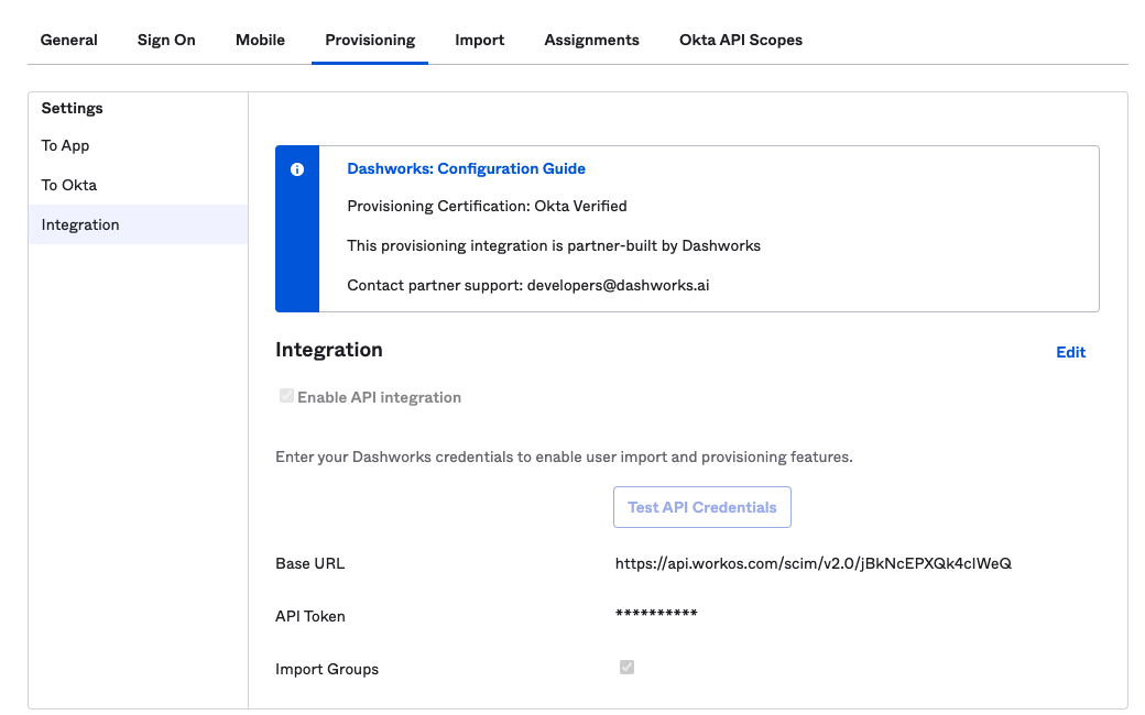 2. Reach out to <support@dashworks.ai> for the SCIM base URL and OAuth Bearer Token for your organization.