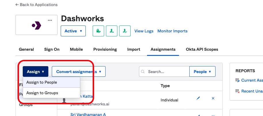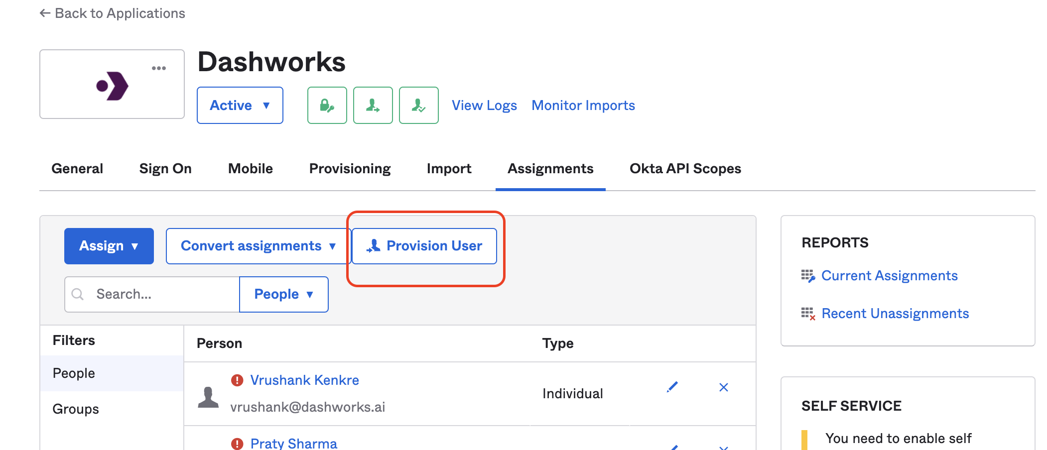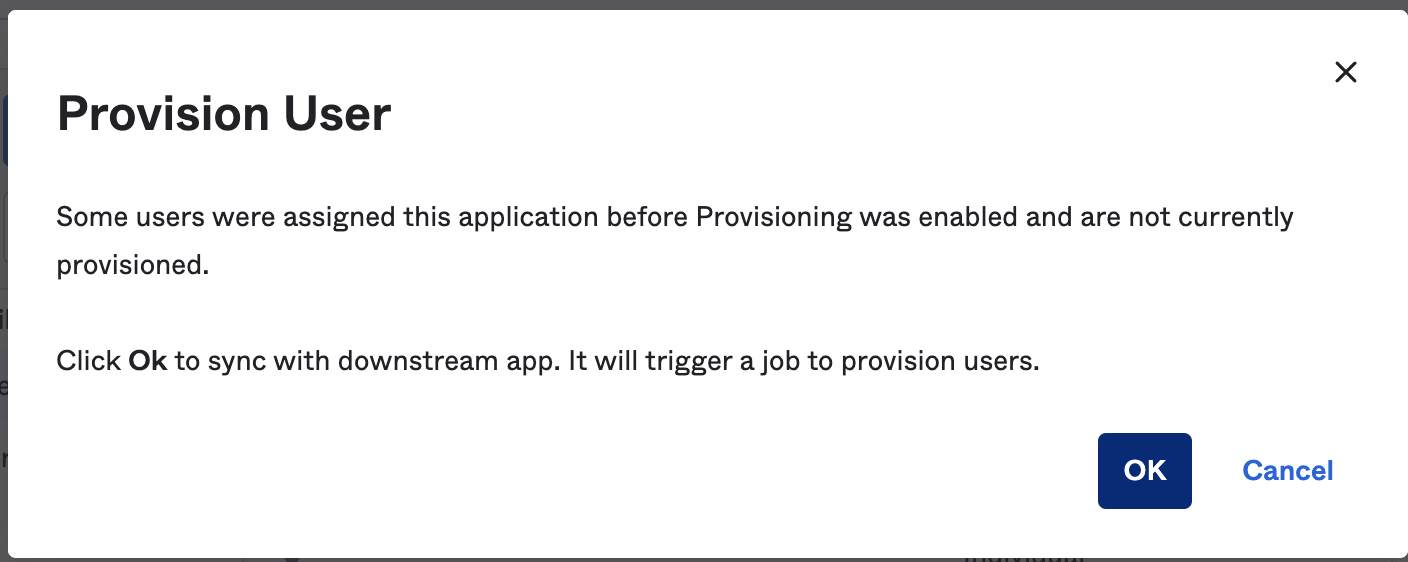6. (Optional) If you have already have an app with assigned users before adding the provisioning feature, you can re-provision users by clicking on the **Provision User** option in the **Assignments** tab and then click **OK** to provision all users.