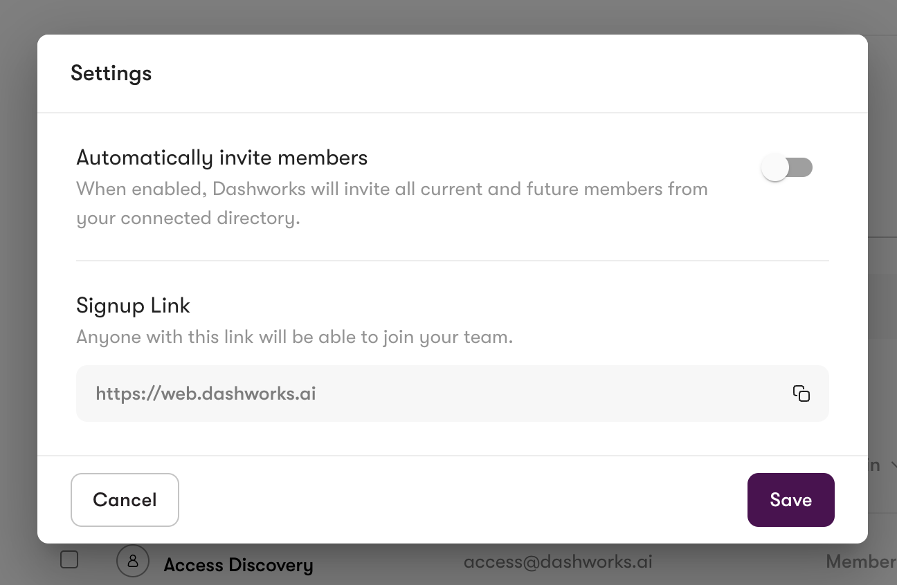 Remember to enable the “Automatically Invite Team Members” option in the Admin Settings. This ensures that all team members can access Dashworks as long as they are active in your organization.