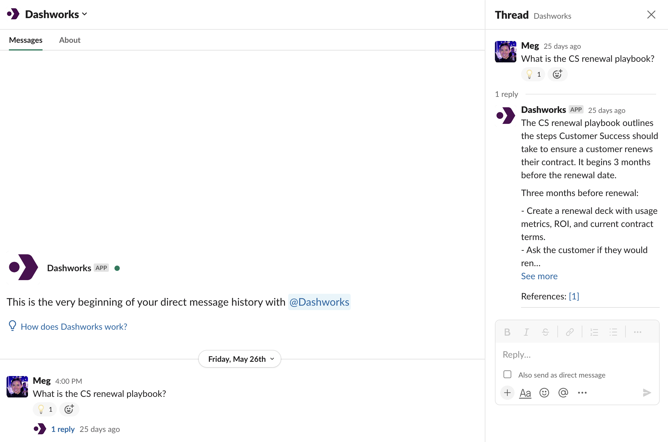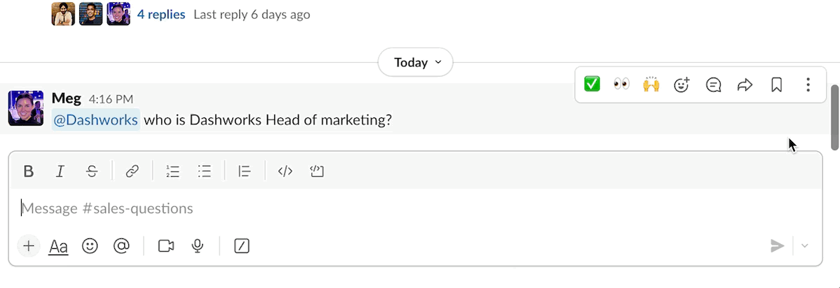 You can trigger a response from Dashworks by tagging it with "@Dashworks" in your question.