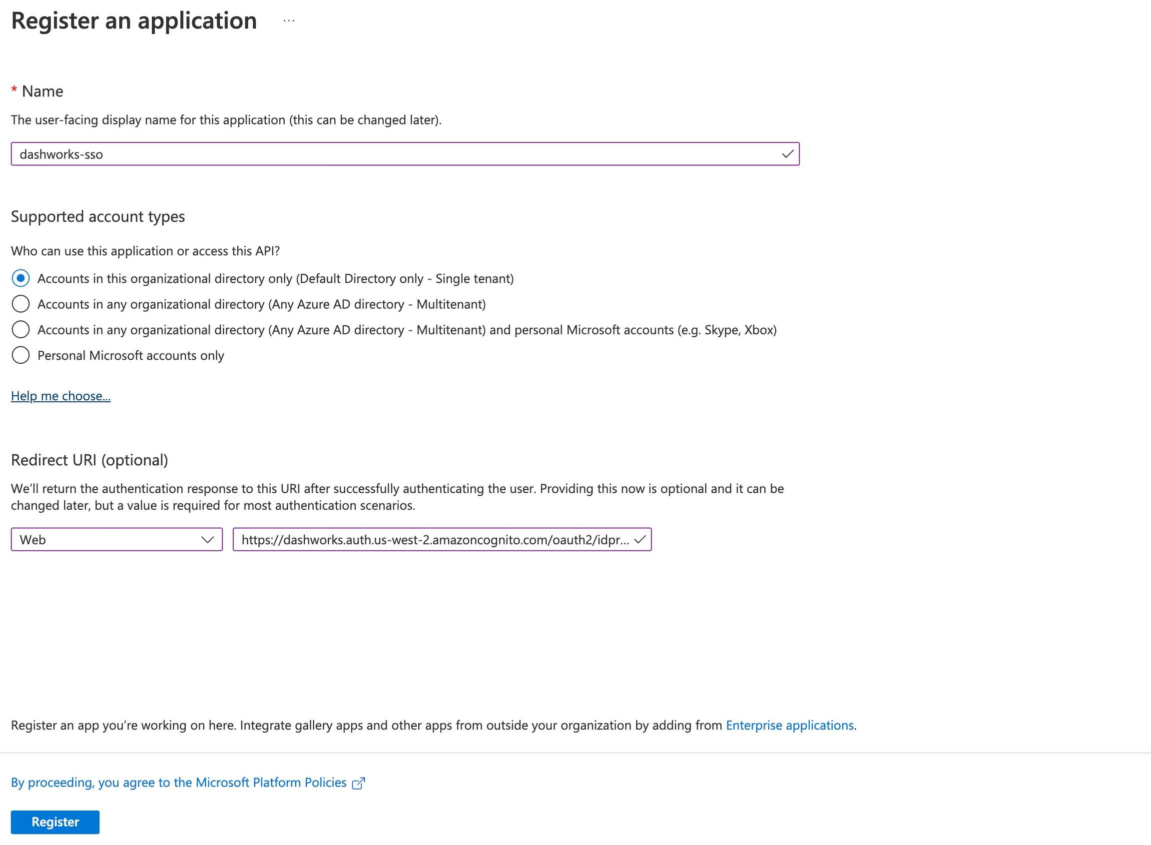 In the app registration form, give a unique name to your application and keep the default option for Supported account types. For Redirect URI, please set Redirect type as WEB and value as https://dashworks.auth.us-west-2.amazoncognito.com/oauth2/idpresponse