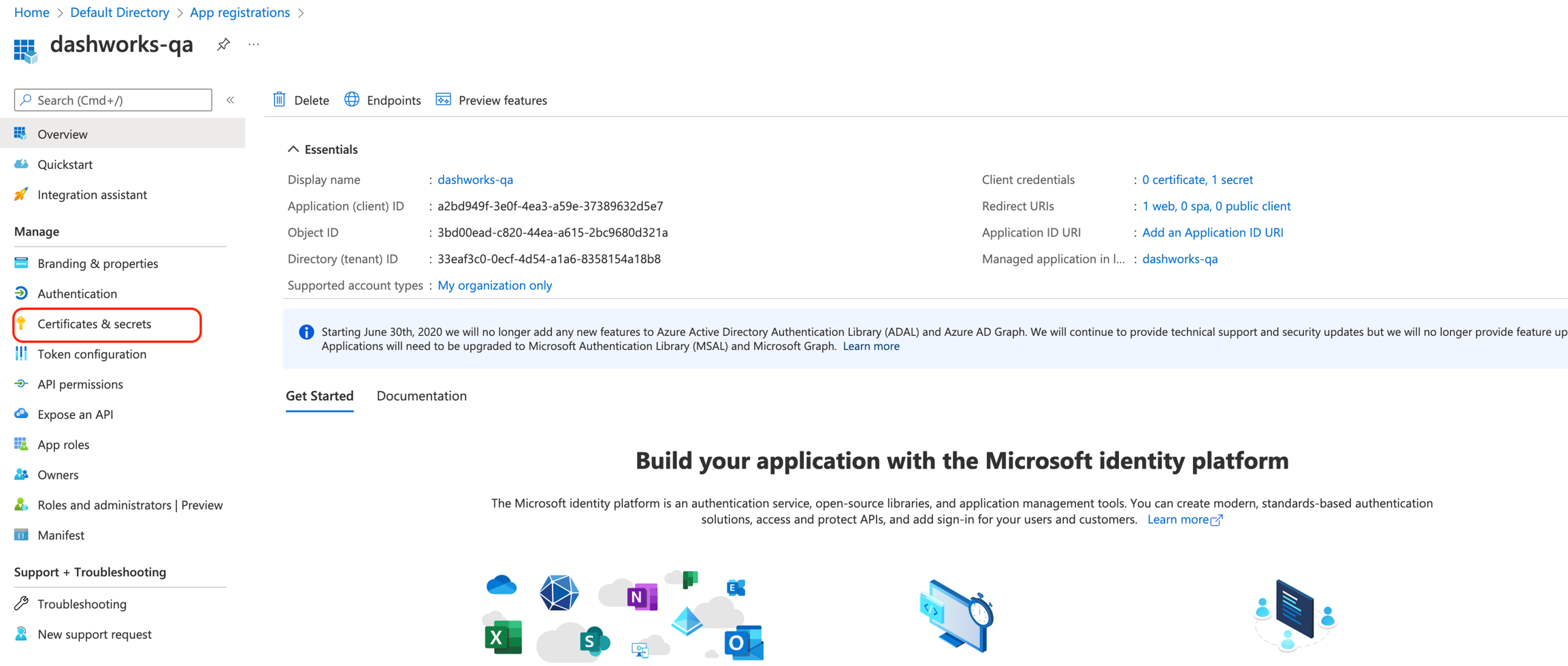 Click on Register and the application will be created. Save the Client ID and Tenant ID (highlighted below) for the newly created app, this will be required in the SSO creation process on Dashworks app