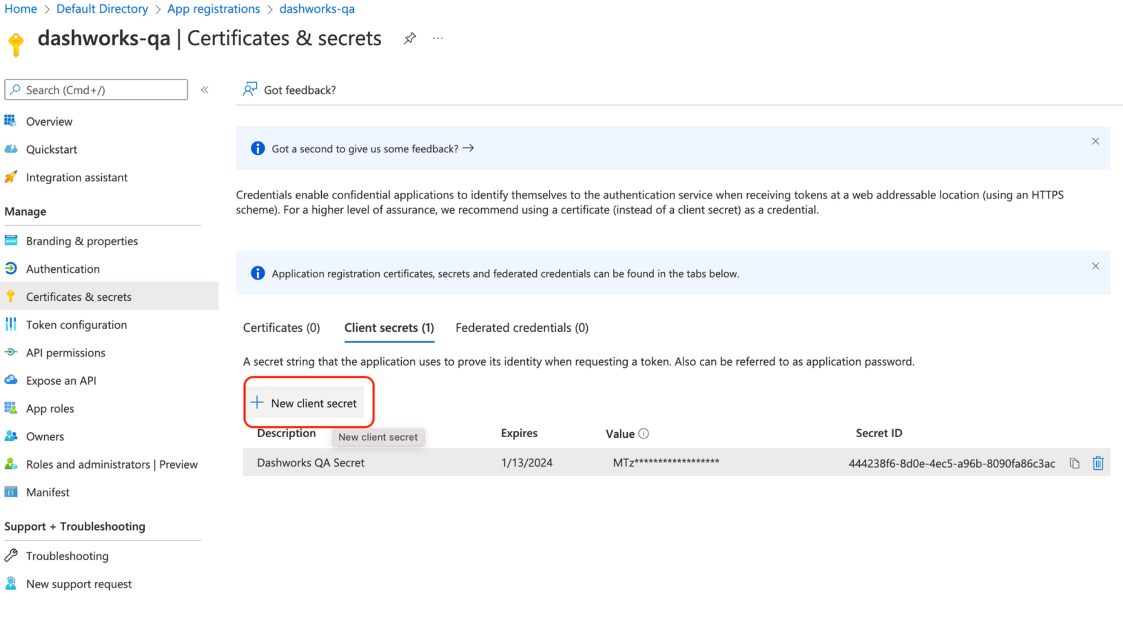 On the left window, select Certificates and Secrets to create a client secret